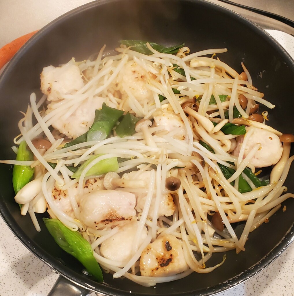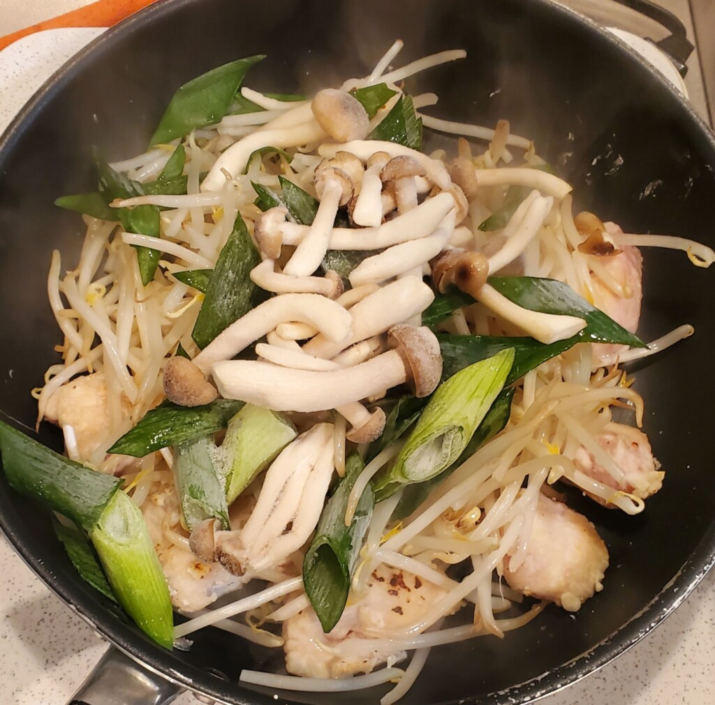 まずはきのこ類ともやし、ネギ、肉をフライパンで炒めます。